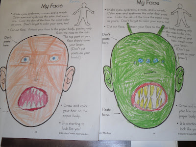 Before beginning the book, kids lay down on butcher paper and have their body traced and cut out.  Then throughout the semester the child learns a few things about a particular body part, and then colors in and cuts out the body part.  Each body part is fastened to the child’s paper body.