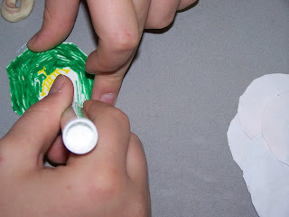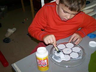3) Paint a thin coat of mod podge (my kids call it “mom podge”) on each circle, on top of the colored image.