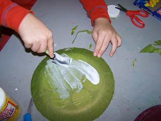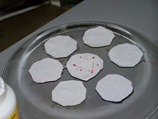 4) When the circles have dried on the plate, center it on a piece of tissue paper, making sure that the side you want to see is facing the plate, not you! Cut around the edge of the plate, leaving about an inch of paper extending beyond the plate.