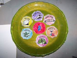 Alternatively, you could have the kids cut out pictures of the different seder foods from magazines, or do a search on Google Images for charoset, horseradish, etc. and paste chosen images into a word document…print in color and use those to decorate the plate.