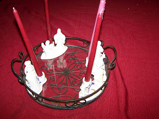 I’m not very crafty, so I construct a very simple advent wreath every year. I have four taper candle holders in Christmas shapes…one looks like angels, one like Mary and Joseph, one like the Magi and one like the shepherds. I place these four candle holders in a “square” shape on the tray, and place a flat bottomed tall white candle in the middle of the square. You could even use votive candles.