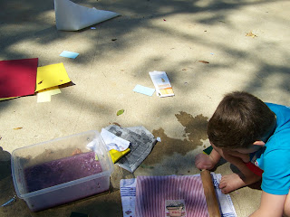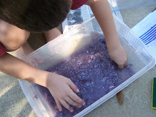 I gave each child a 5 quart ice cream bucket and laid out a stack of different kinds of paper. Each child took whatever paper he wanted and tore it into shreds. I asked them to tear up about 4 to 6 cups of paper each, or about half a bucket full. This yielded about 2 or 3 pieces of finished paper per child.