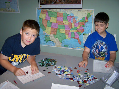 2) Lay out the mosaic glass on top of the coloring page, following the pattern as best you can. This was delicate work that called for patience and a steady hand. My 7 year old was able to do it, though it took him longer than the older boys. Our four year old had no patience for this process, so he just made a free-form snake.